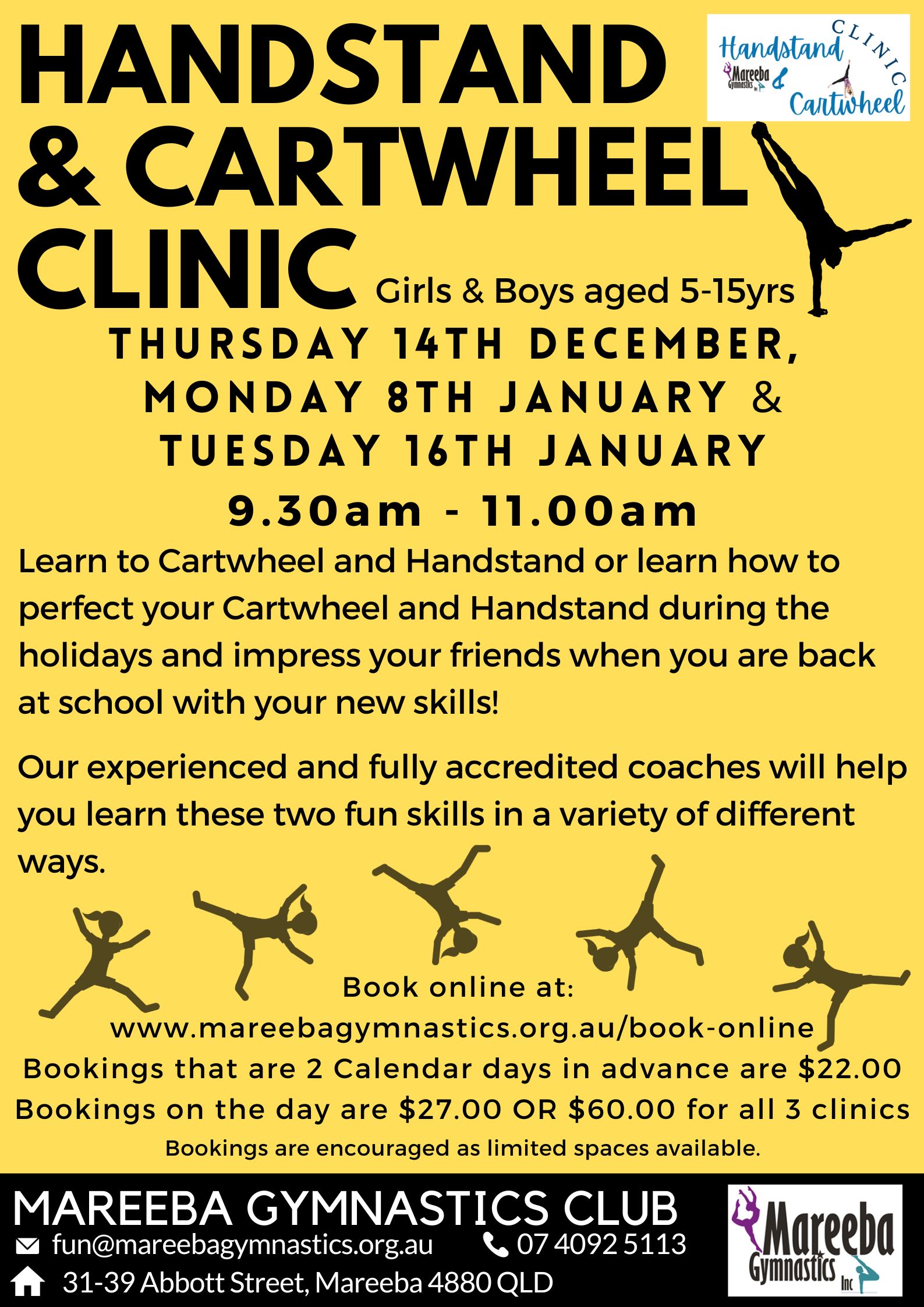 Come along and learn how to Handstand & Cartwheel in a fun and nurturing environment these school holidays. Our experienced and fully accredited coaches will help you learn these two fun skills in a variety of different ways. If you can already Handstand and Cartwheel come along to learn how to either perfect your skill or how to build onto your already amazing acrobatic skills
